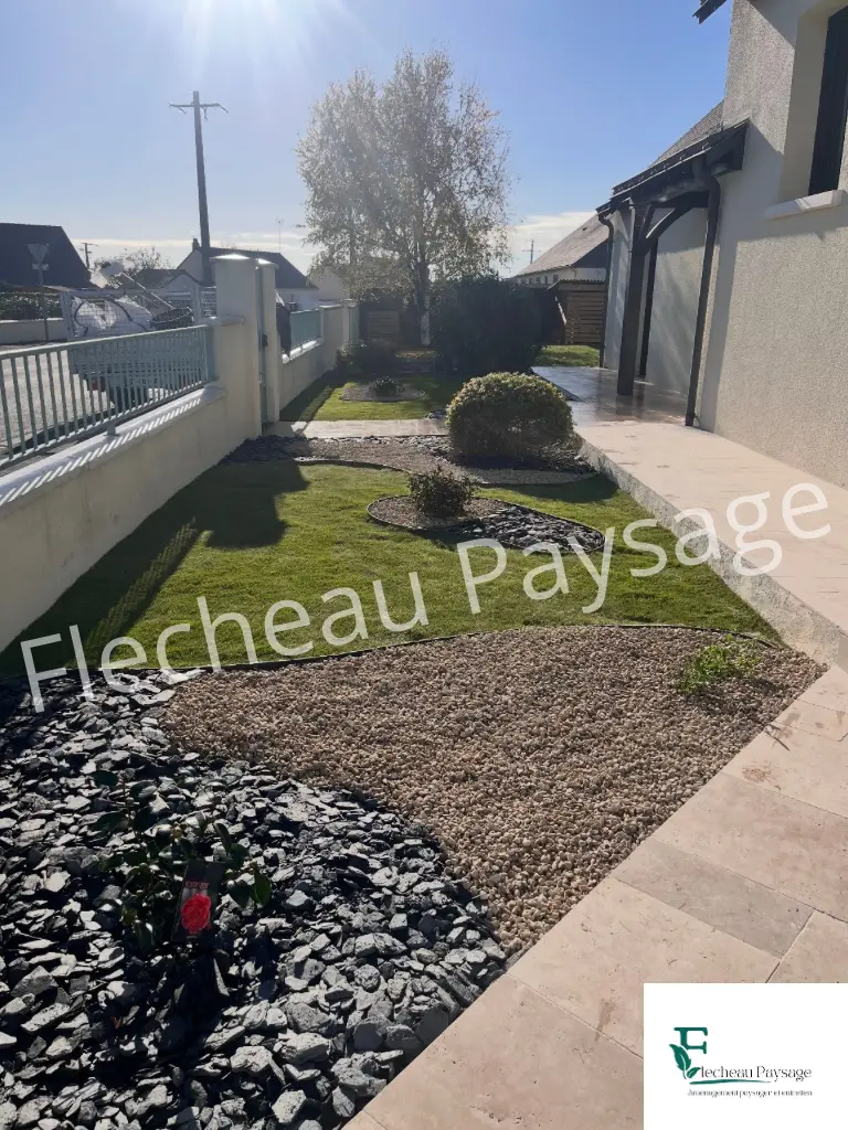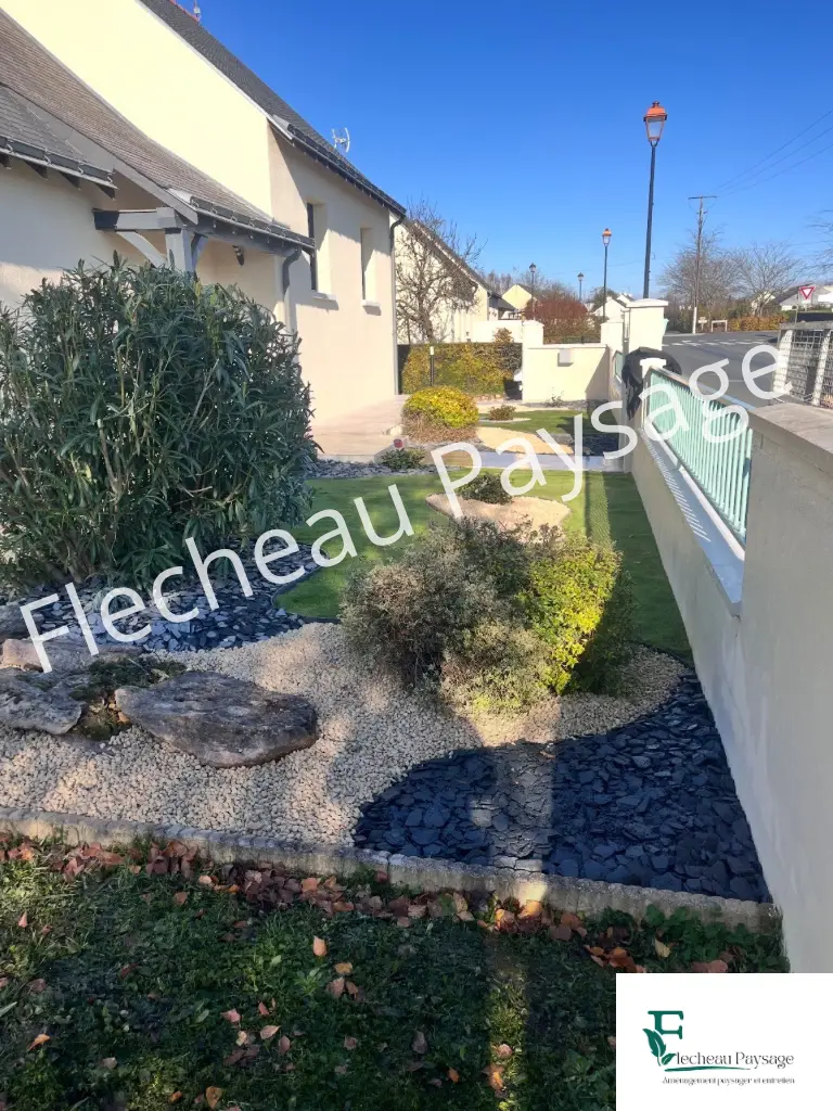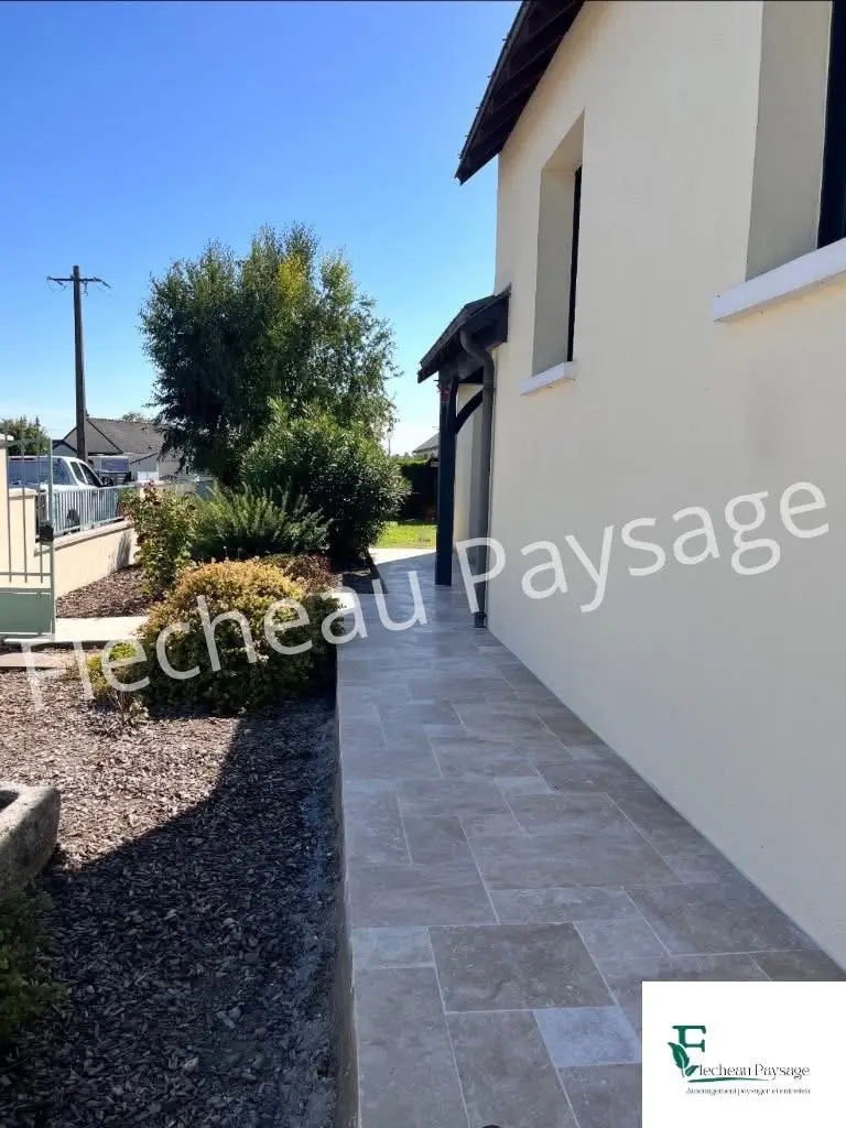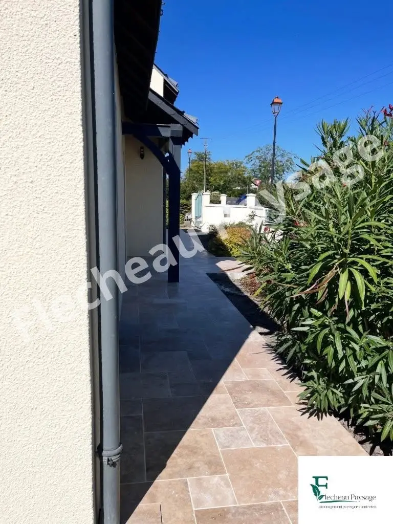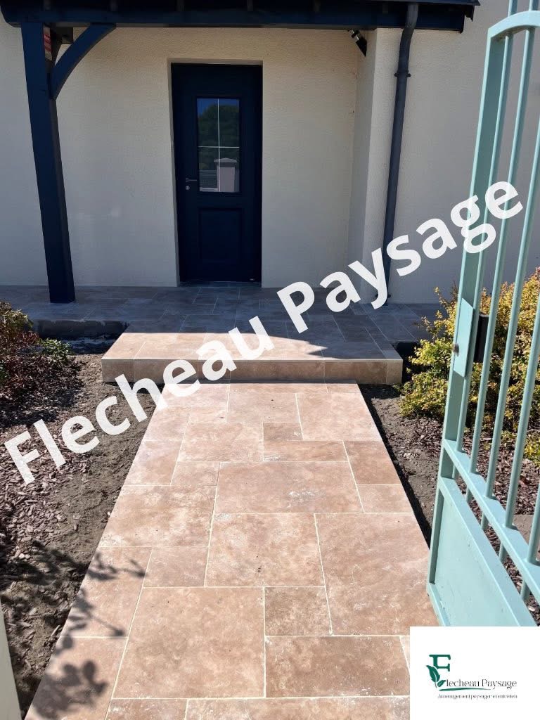 À Bellevigne-les-Châteaux, Flecheau Paysage a sublimé un extérieur grâce à une allée en dallage travertin et un massif minéral soigneusement conçu.