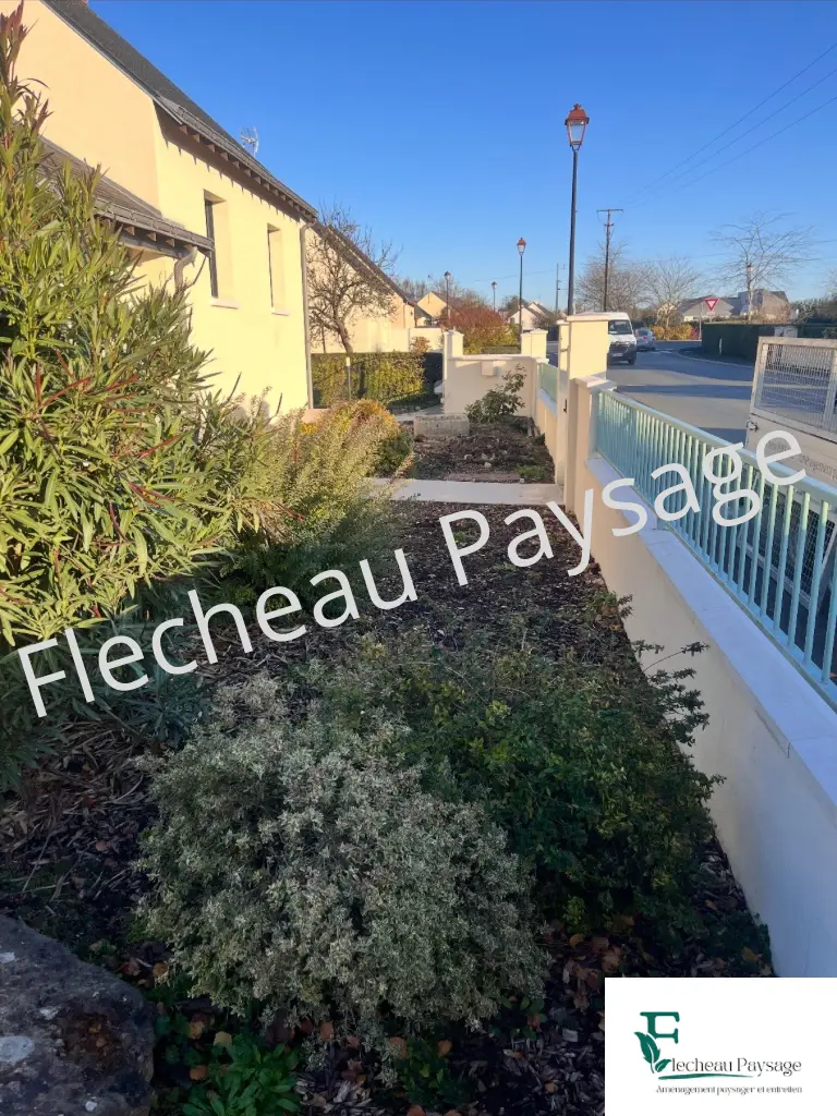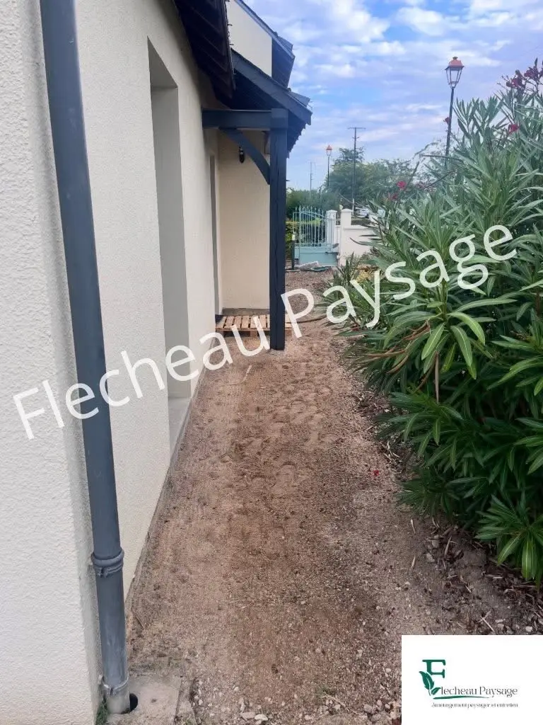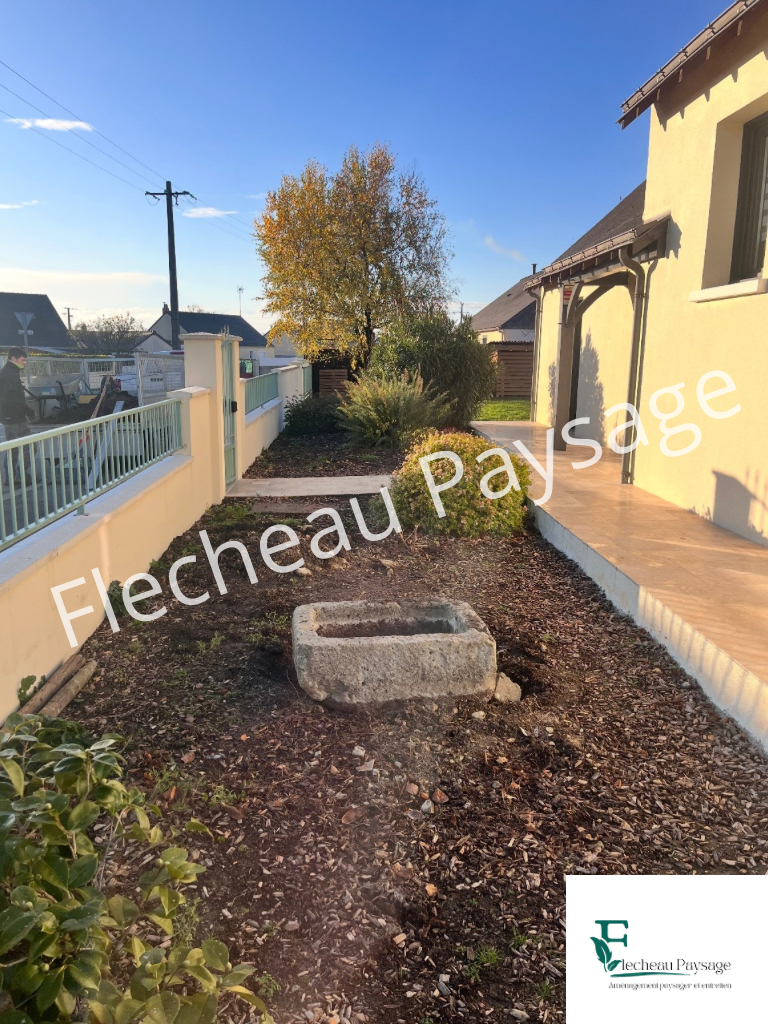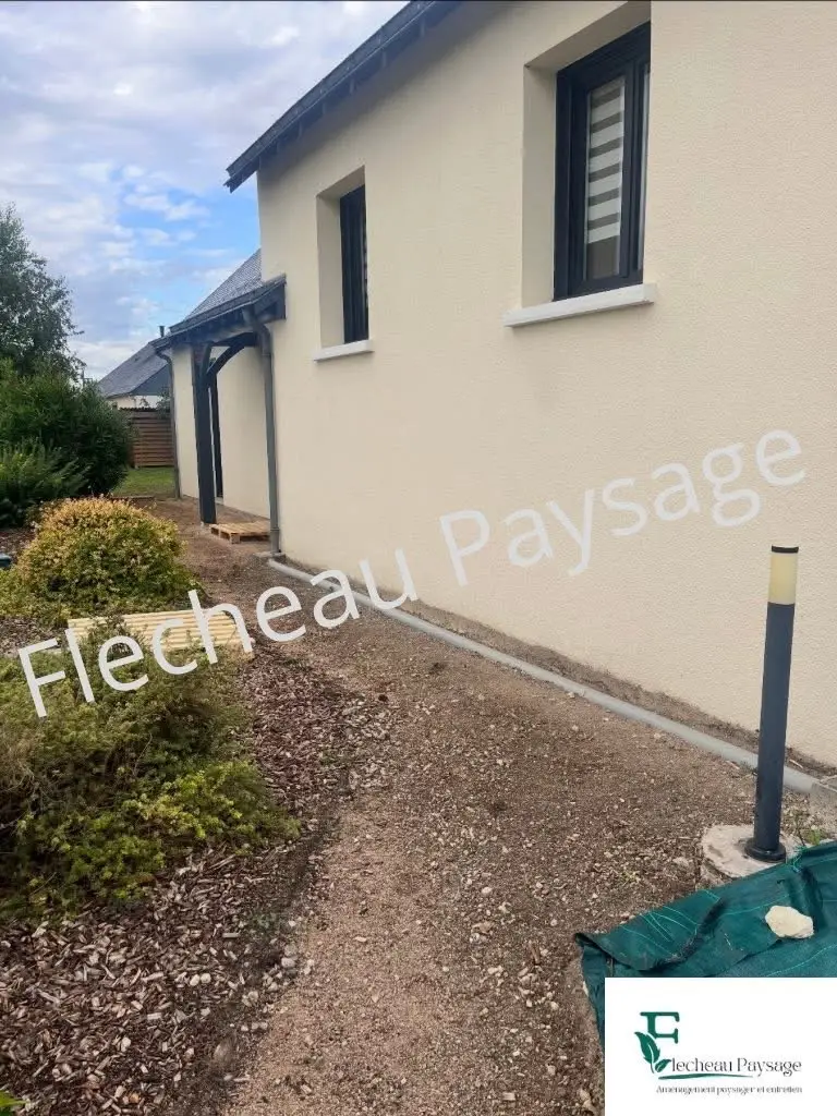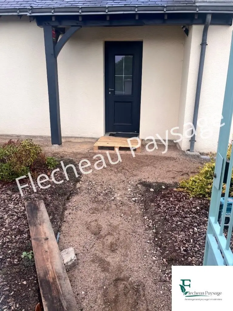 À Bellevigne-les-Châteaux, Flecheau Paysage a sublimé un extérieur grâce à une allée en dallage travertin et un massif minéral soigneusement conçu.