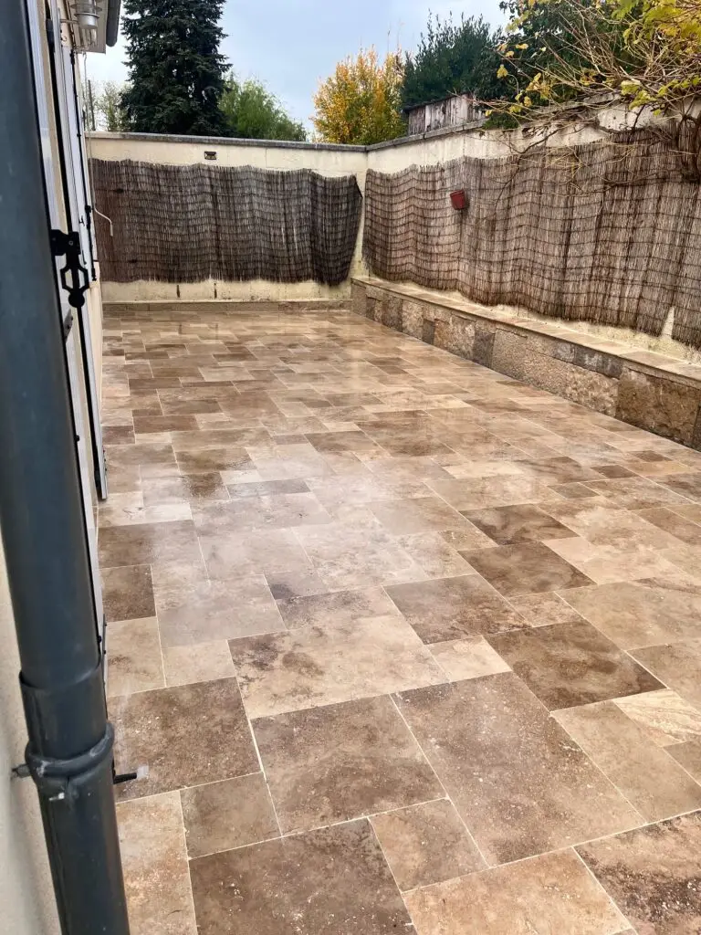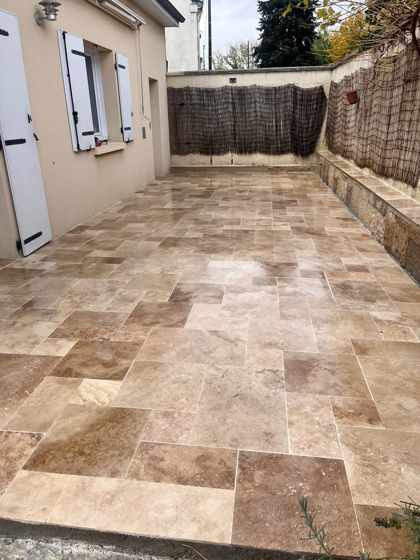 Terrasse en travertin, parement en pierre naturelles, pose d'une clôture et portillon