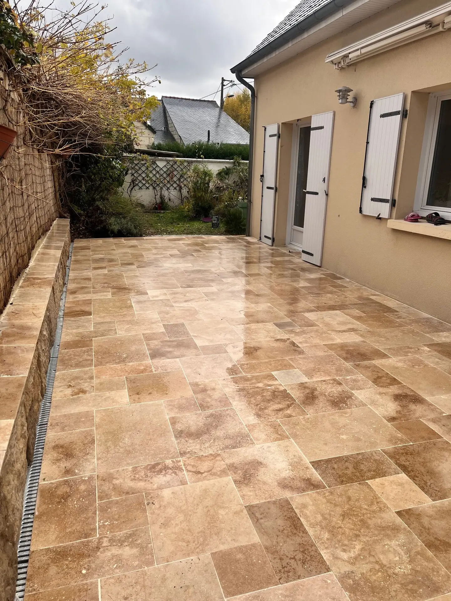 Alliance de chaleur et d’authenticité avec cette terrasse en travertin, sublimée par un parement patrimoine.